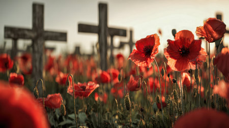 Crosses marking soldiers' graves stand amidst blooming poppies, representing the sacrifice and remembrance of fallen heroes.