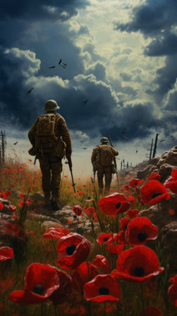Poppy flowers on a field with soldiers