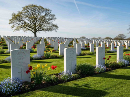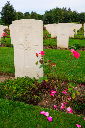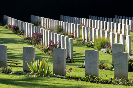 Proven, Flanders, Belgium - September 15, 2018: Overview of Mendinghem British war cemetery under blue morning sky. Green lawn, beige tomb stones and red roses with dark green trees sprinkled.