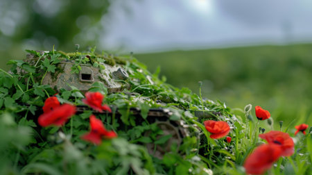 A captivating image showcasing a miniature tank seamlessly integrated into a lush field, adorned with vibrant red poppies and greenery, creating a tranquil and artistic composition.