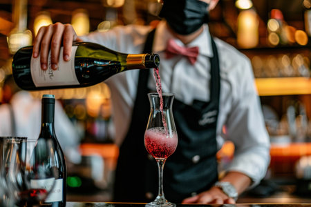 Bartender pouring wine into glass at counter in restaurant, closeup