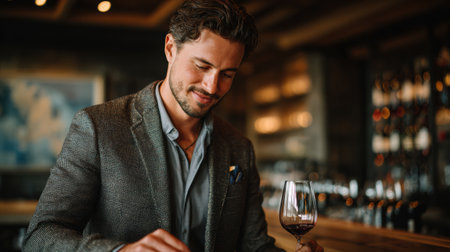 Winemaker carefully tests wine aroma in a glass inside a warm and inviting tasting room, highlighting the nuances of the beverage.