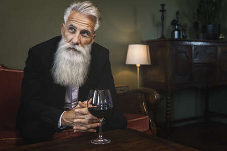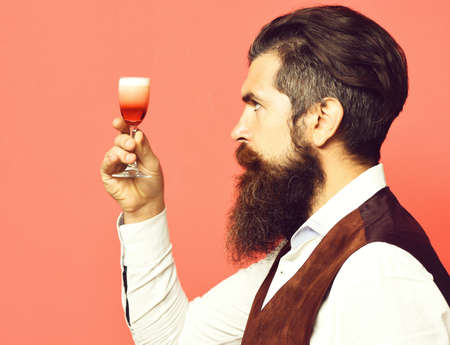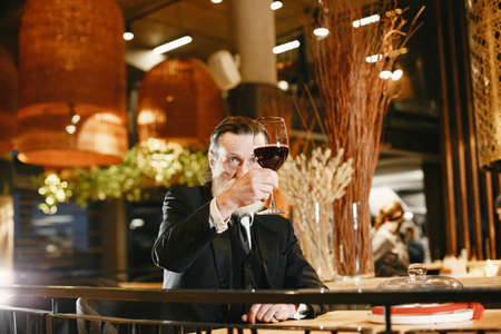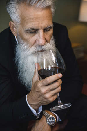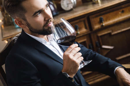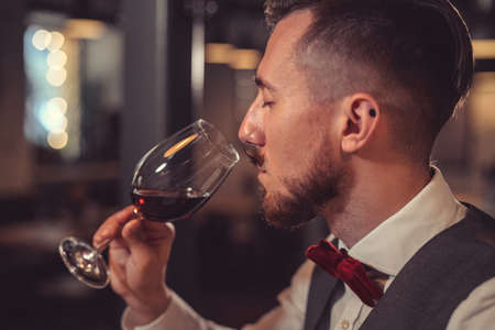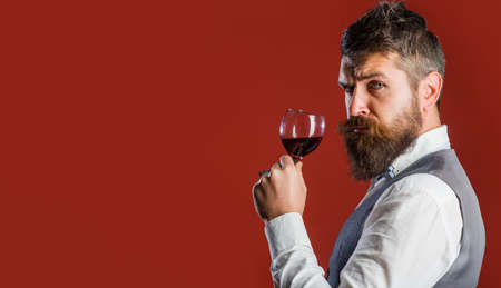 Berded man tasting glass of wine. Degustation concept. New year party. Serious man drinking red wine. Sommelier tasting red wine. Man in waistcoat drink glass of red wine. Selective focus on glass.