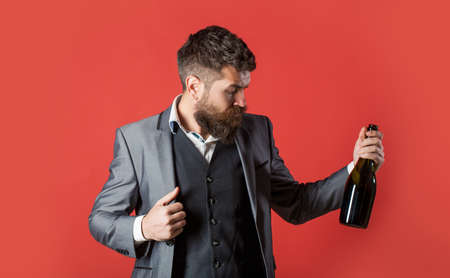 Bearded man with a bottle champagne of and glass. The person holds a red wine bottle in a hand. Man holding bottle with champagne, wine