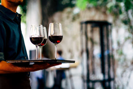 Waiter is carring plate with red Wine glasses. glasses. Wine glasses.