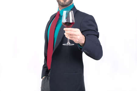 Man hand with glass of red wine. Tasting alcohol. wine tour. Male sommelier with wineglass. close up