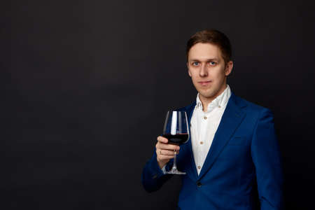 Handsome man in suit drinking champagne on black background. Portrait of elegance gentleman with glasses. Confident adult man in suit holding glass of champagne in studio. Luxury party.