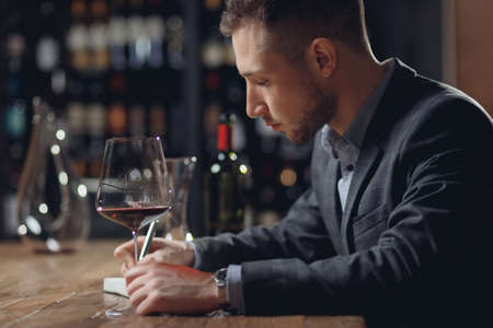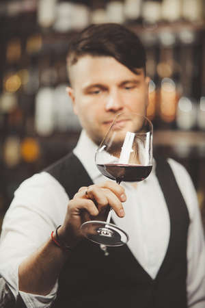Sommelier responsibility work within taste preference. Red wine at degustation. Sommelier appreciating drink. Specializes in all aspects of wine service. Bartender at bar. Sommelier taste wine