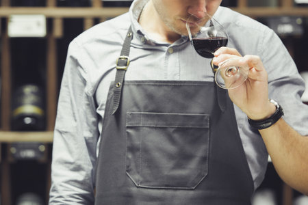 Male sommelier tasting red wine. Winemaking. Occupations.