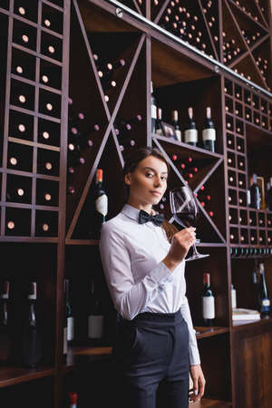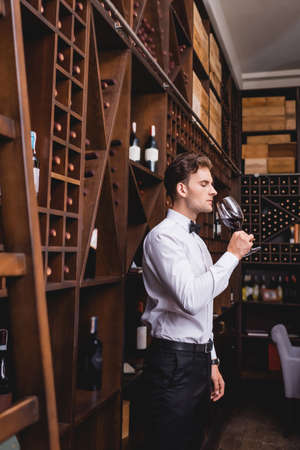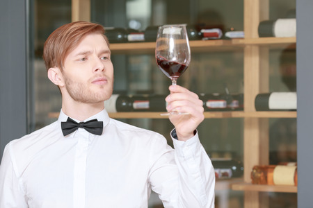 Confident and experienced sommelier. Close-up of confident young man wearing bow tie holding wine glass with red wine and watching its texture with wine shelf in the background