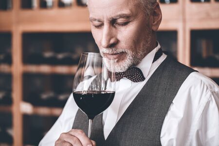 Sommelier Concept. Senior man standing holding glass smelling wine closed eyes joyful close-up