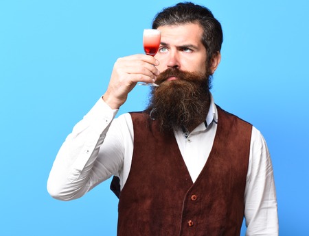 handsome bearded man with long beard and mustache on serious face tasting glass of alcoholic shot in vintage suede leather waistcoat on blue studio background