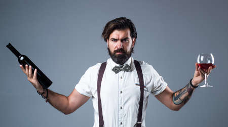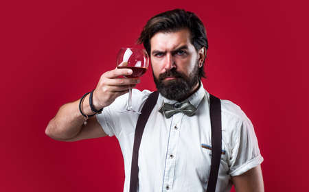 Alcohol use is life abuse. handsome hipster drinking wine glass. sommelier tasting alcohol. bearded man in suspenders drink red wine. brutal guy bartender in bow tie. elegant male barman. copy space
