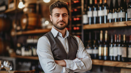 A well-dressed man stands with his arms crossed, smiling in a sophisticated restaurant. The background features an impressive collection of wine bottles, creating an elegant atmosphere.