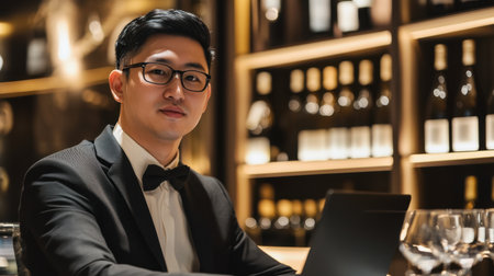 A sophisticated young man in a tuxedo smiles while working on a laptop in a chic restaurant, highlighting the blend of professionalism and modern dining environment.