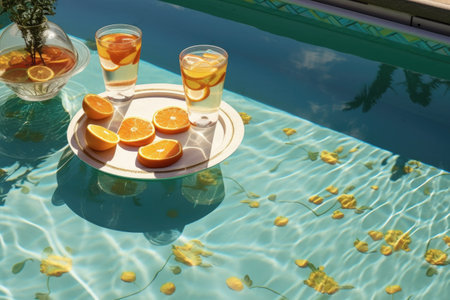 Refreshing summer drinks and orange slices beside a swimming pool. Created with Generative AI technology