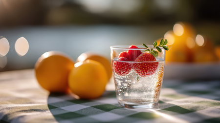 A vibrant glass filled with sparkling water and fresh berries sits on a checkered tablecloth, surrounded by citrus fruits, capturing a refreshing summertime essence.