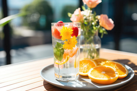 Fruitinfused Sparkling Water On Plate In Botanicalstyle Cafe