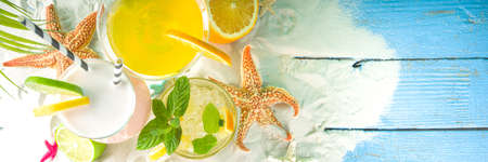 Summer tropical sea holiday vacation concept. Three various glass with summer cold cocktail drinks, on sand with seashells and starfish, light blue wooden background