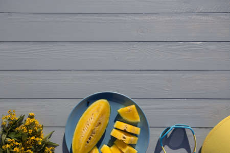 Summer flat lay in yellow and blue colors with yellow watermelon on wooden background