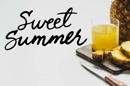 pineapple juice in glass near delicious fruit on cutting board and sweet summer lettering on white