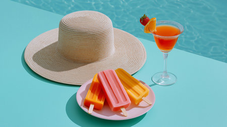 Bright popsicles and a fruity drink sit on a plate beside a sun hat by a sparkling pool.