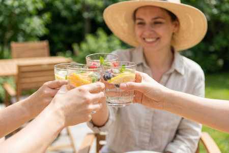 Group of friends celebrating, making a toast with fruit infused sparkling water at an outdoor garden party, enjoying social time and refreshing beverages