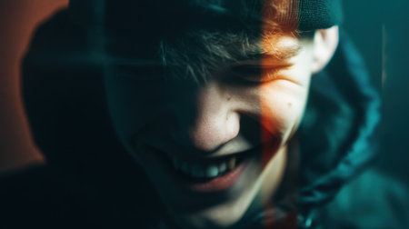 A vibrant portrait featuring a young man smiling, enhanced by dramatic lighting that casts shadows, creating an emotional and artsy atmosphere.