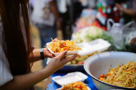 Female hand hold fork with Papaya salad, Thai food name Som Tum, on white foam plate