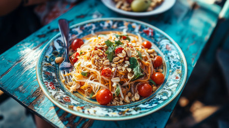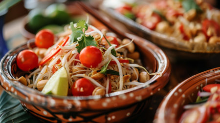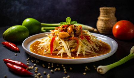 the vibrant colors and flavors of Som Tum take the spotlight. This Thai classic salad is a tantalizing combination of green papaya, chili, lime, fish sauce, and a medley of vibrant ingredients. Each bite is an explosion of sweet, spicy, and tangy notes, a culinary dance that embodies the essence of Thai cuisine. It's a snapshot that transports you to the bustling streets of Thailand, where the air is filled with the aroma of this beloved dish, and where every forkful is a refreshing and fiery adventure for the taste buds.generative ai