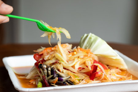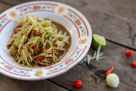Thai papaya salad or Somtum in Thai. The famous local Thai street food dish with the taste of hot and spicy on wood table. Street food in Thailand.
