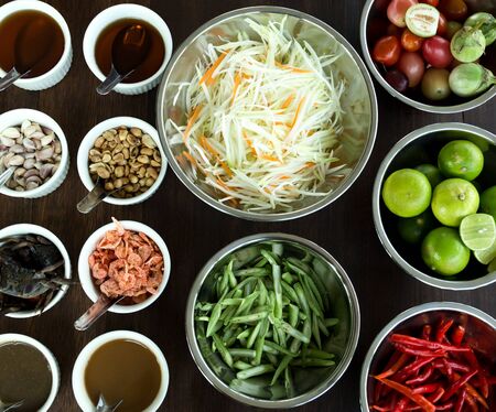Papaya salad (Som Tam) ingredients on wooden table background.The famous local Thai street food dish with the taste of hot and spicy.