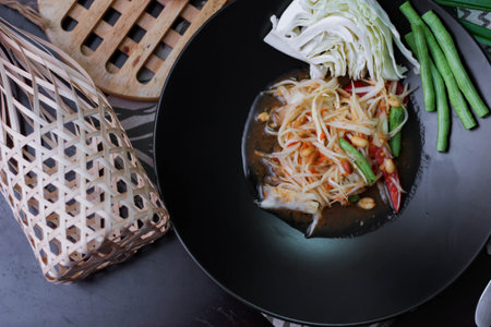 Papaya salad, Thai traditional food or name in Thai Somtum, papaya in fermented fish sauce with vegetable and pork cracklings in black dish on wooden table