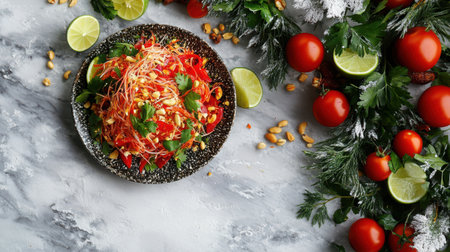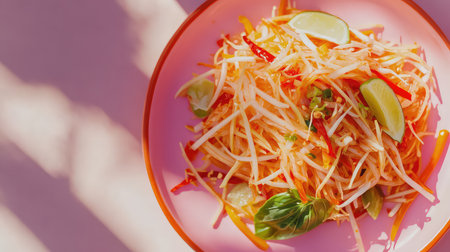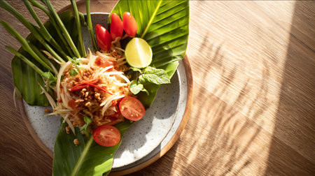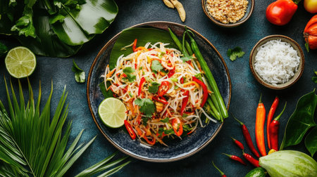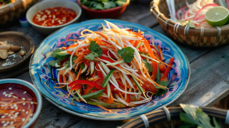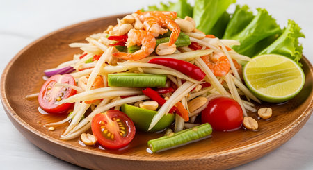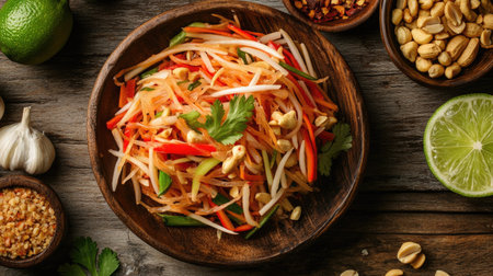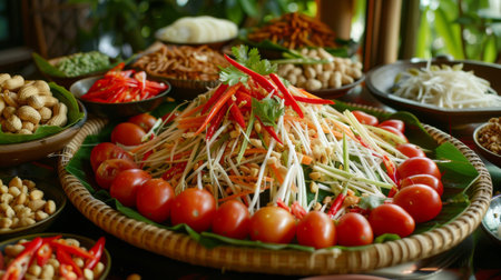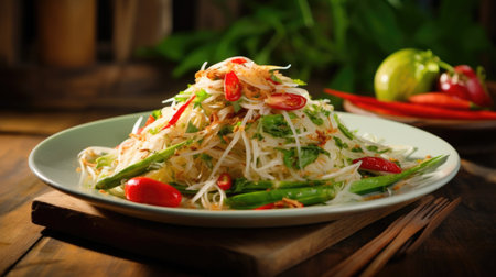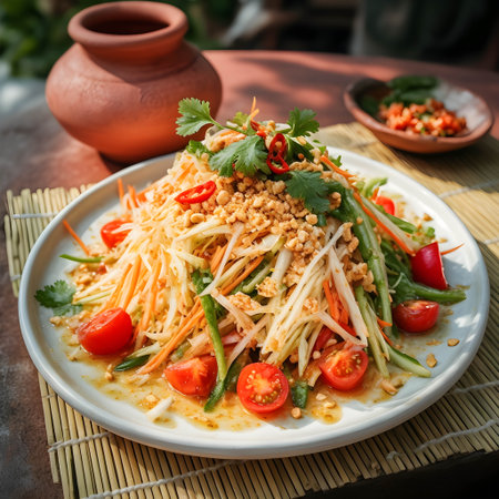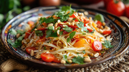 A beautifully arranged plate of Thai papaya salad with colorful garnishes, enticing viewers with its vibrant presentation and fresh ingredients.