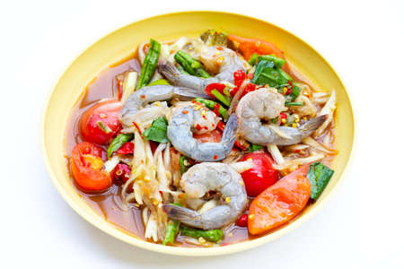 Papaya salad with shrimp in yellow plate