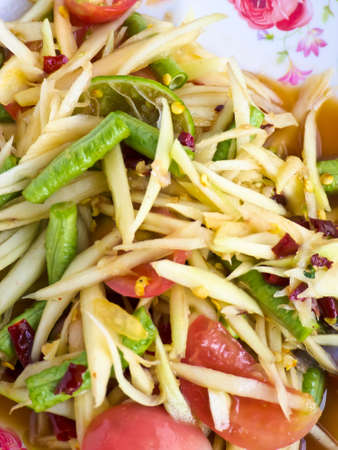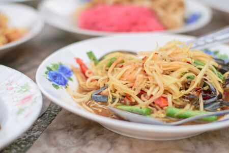 close up Somtum is famous Thai food, spicy salad good for diet