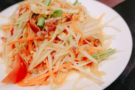 Papaya salad, Thai traditional food. It is mainly made from sliced papaya mixed with spices.