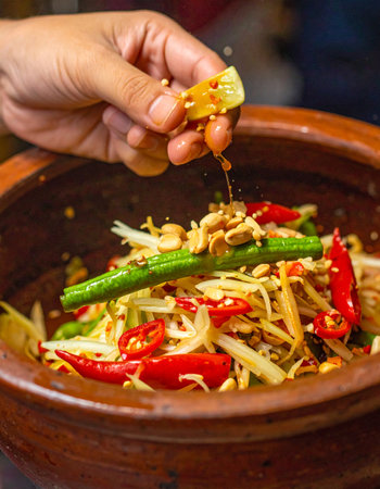 A chef's hand adds the final touch, squeezing a fresh lime to balance the spicy, sweet, and savory flavors of an authentic Thai green papaya salad.