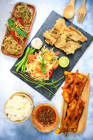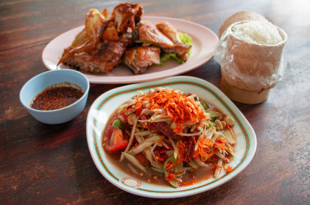 Thai spicy papaya salad with grilled chicken and sticky rice on table