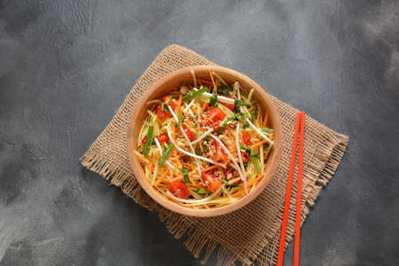 Fresh and spicy green papaya salad on a wooden table