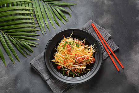 Thai gourmet : Healthy of Thai green papaya salad top view or Som Tum. Som Tum is original local food from the Northeast of Thailand