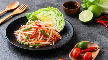 A vibrant papaya salad featuring fresh ingredients like lime, red chili, and herbs, ideal for healthy diets. A colorful presentation enhances any dining experience.