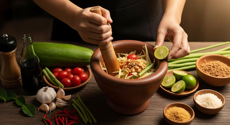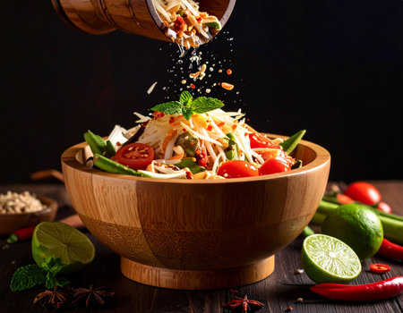 AI generated authentic thai som tum pu spicy crab papaya salad with fresh ingredients falling into wooden mortar bold flavors crunchy texture iconic street food