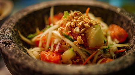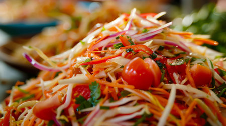 Close-up of freshly prepared som tam salad, bursting with colors and flavors of shredded papaya, tomatoes, and spicy dressing, a staple of Thai street food