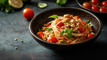 A traditional Thai dish of Som Tum (green papaya salad) with shredded papaya, cherry tomatoes, and peanuts, served in a traditional bowl with a vibrant and fresh look.