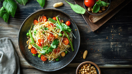 An overhead view of a delectable Asian noodle dish, beautifully garnished with fresh vegetables, nuts, and aromatic herbs, showcasing vibrant colors and textures that entice the senses.