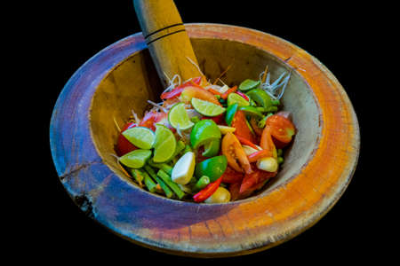 Preparing papaya salad and ingredients in a mortar, Thai style street food.