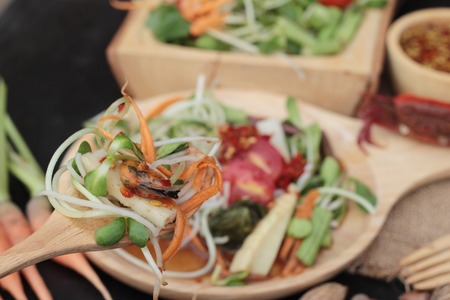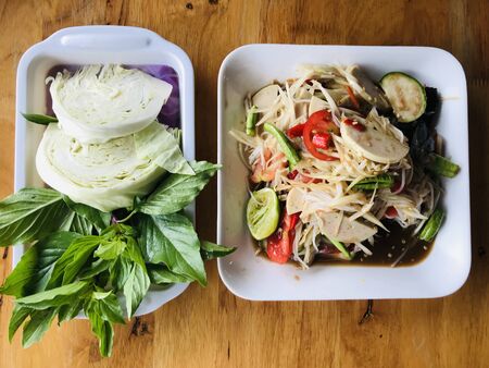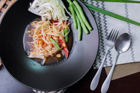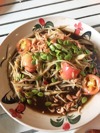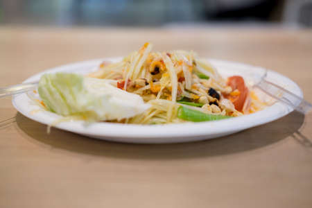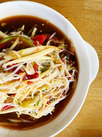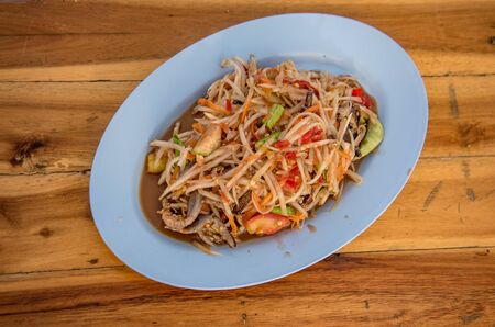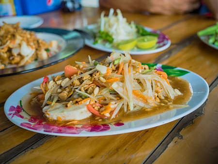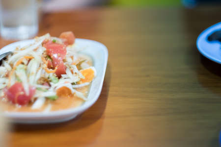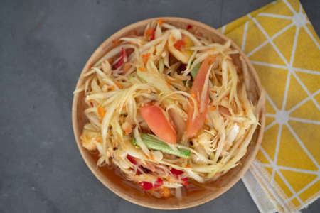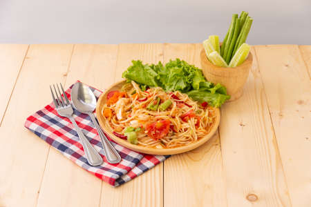 Thai papaya salad or Somtum in Thai. The famous local Thai street food dish with the taste of hot and spicy on wood table. Street food in Thailand.