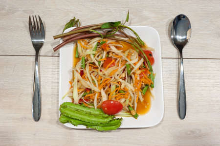 Somtam in a plate on a wooden table, papaya salad, Somtam is the name of a Thai food that has a spicy taste.