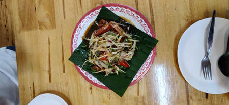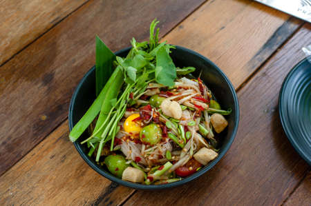 Thailand favorite menu call somtum That was papaya spicy salad with salted egg on wood tabel
